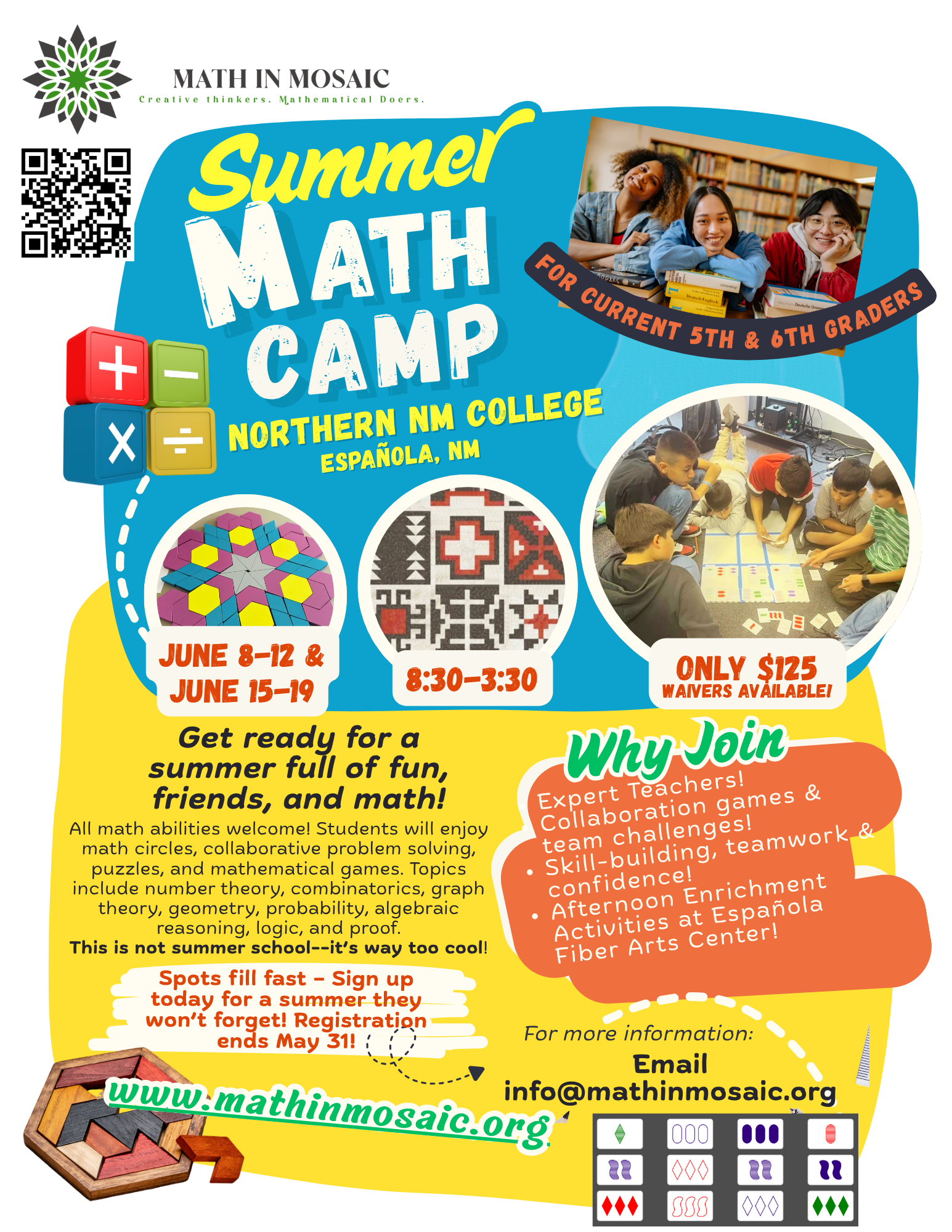 Math in Mosaic invites rising 6th & 7th graders to explore mathematics through games, puzzles, art, and traditional weaving — in a joyful, welcoming community that believes every student is a math person.